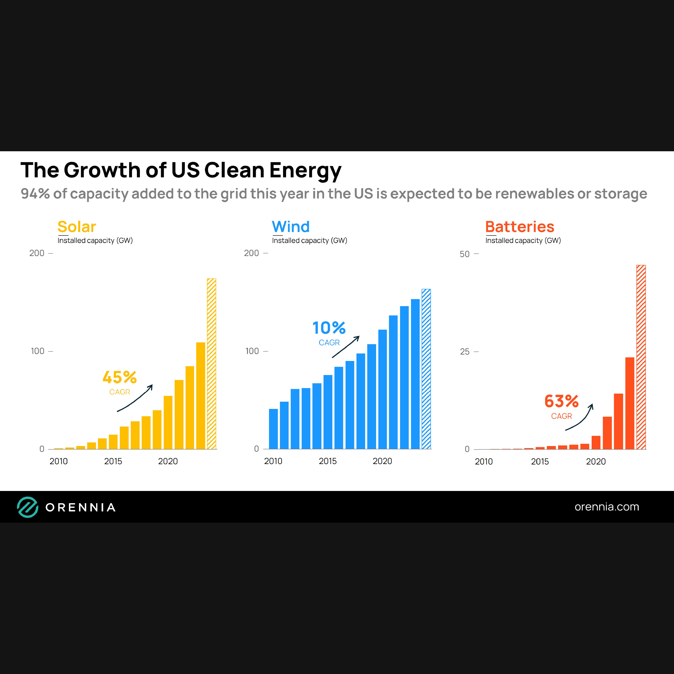 Orennia forecasts 37 GW of U.S. solar growth in 2024 while wind slows to 7 GW, highlighting a shift in renewable momentum.