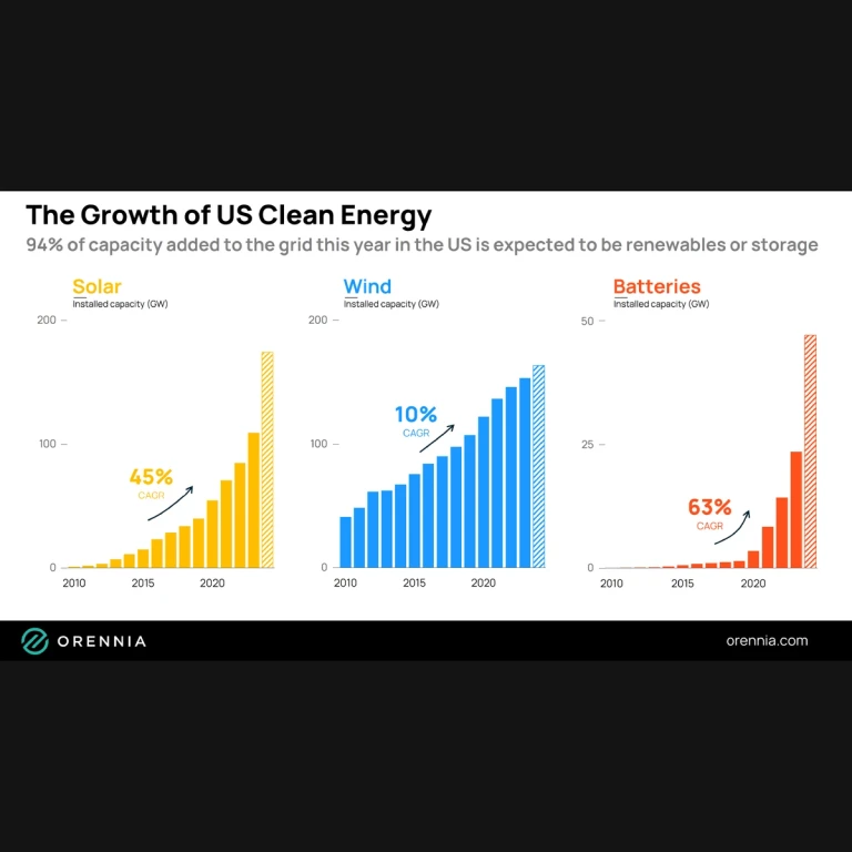 Orennia’s analysis shows solar will account for half of all new US capacity in 2025, with storage growing fast in solar-heavy areas.