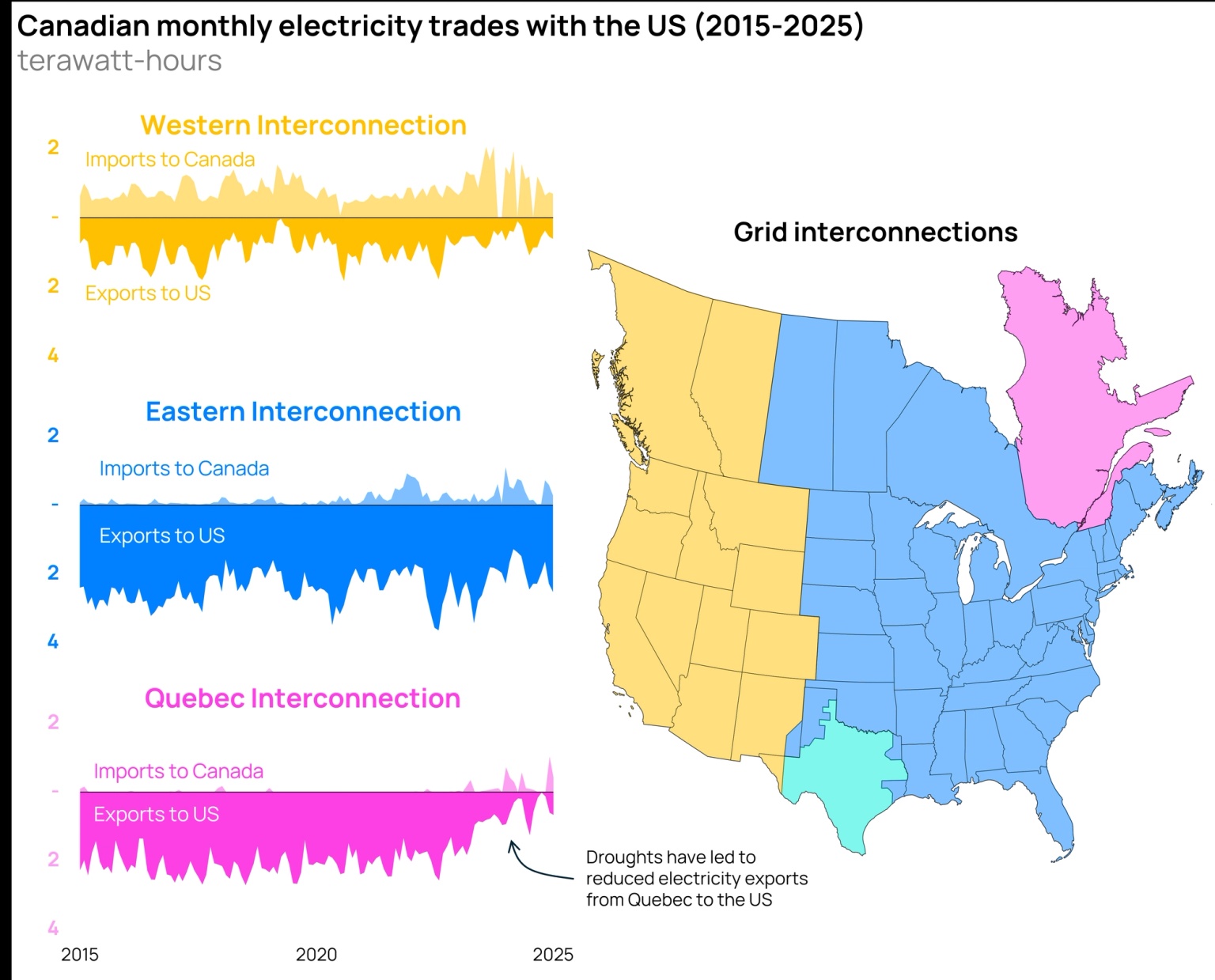 And contrary to popular belief, electricity trade is not entirely one way. From 2015 to 2022, for every six gigawatts Canada exported to the US, it imported one back.