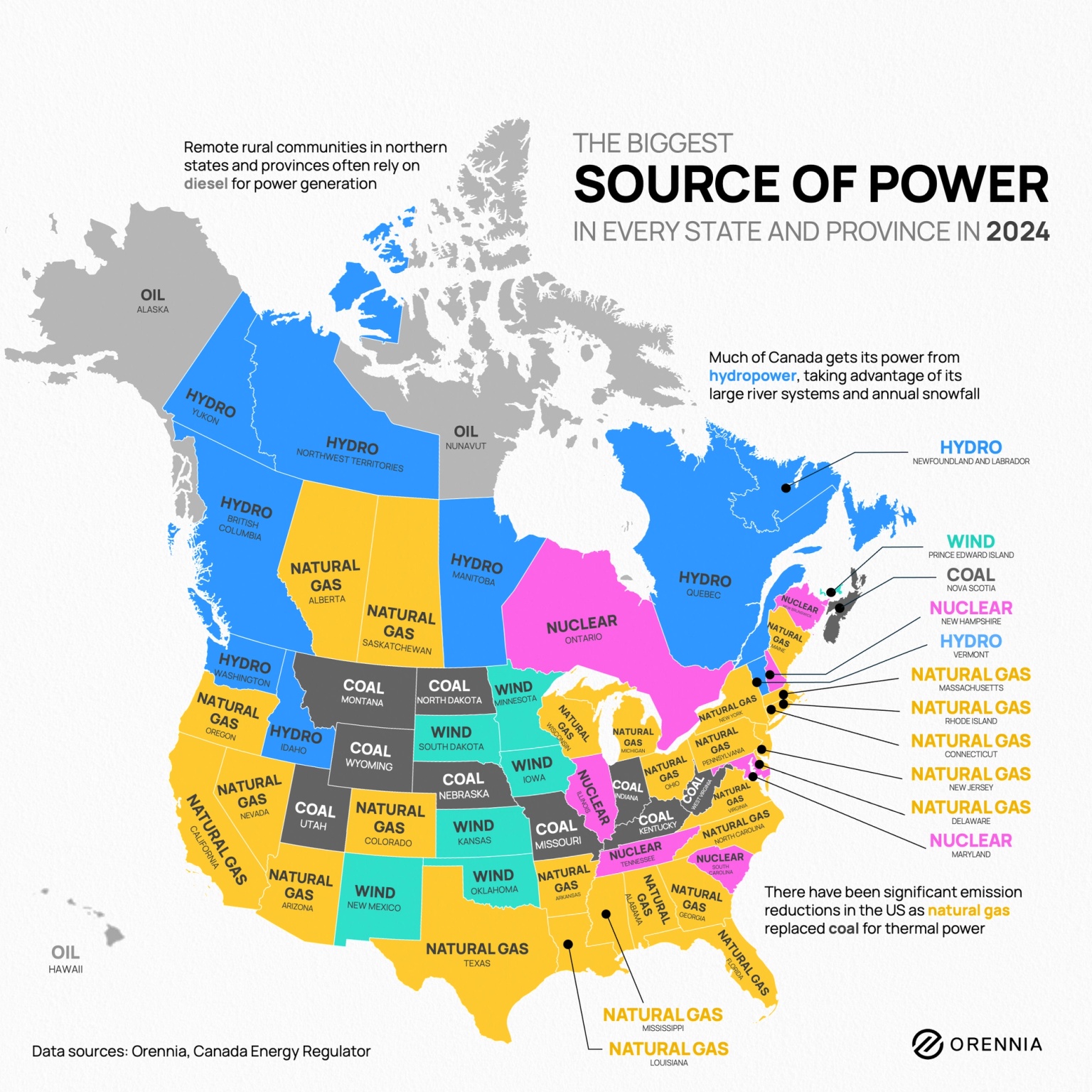 Power generation across the US and Canada is tied to long histories of natural resource development and technological innovation. Today’s electricity sources reflect distinct energy regions across North America.